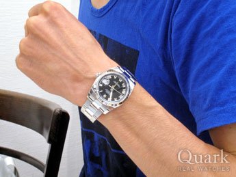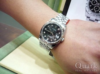 結納返しの品として探していたところ、一番二人が気に入ったモデルが、このデイトジャスト・ブラックサンビームでした。腕に着けた時、華やかなダイヤルだけど、ケバケバしていないところがカッコイイです!(新郎様) とてもよく似合ってました!(新婦様)