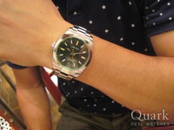シンプルなデザインと、グリーンのサファイヤクリスタルに一目惚れしました!! リューズの王冠マークの位置が、丁度真っ直ぐになっている所も気に入っています!! 3年保証価格で、12年保証(オーバーホール基本工賃3回分無料特典付)と言う事で、クォークに決めました!!