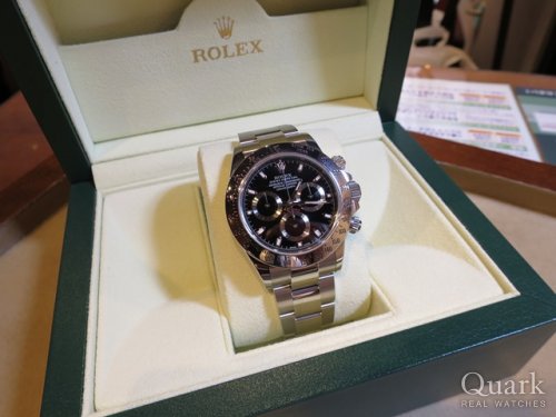 T様 いつもクォーク上野本店をご利用頂き誠にありがとうございます。今回はDAYTONA Ref.116520黒のご購入のお手伝いが出来た事、大変嬉しく思います。ロレックス初の自社製クロノグラフ・ムーヴメントCal.4130を搭載し2000年に登場してから2016年まで生産されたRef.116520です。現行モデルがセラミックベゼルなった事により、ステンレスベゼルの最終型との噂もあるクロノグラフです。ご使用頂き、しっかりとサポートさせて頂きますので今後、お時計の事で何かございましたらお気軽にご相談下さいませ。宜しくお願いいたします。
