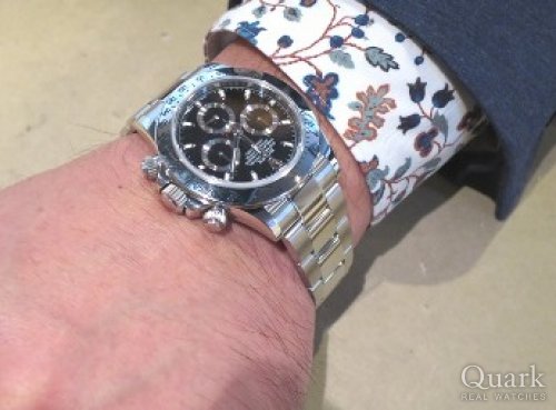 A様 この度はクォーク上野本店をご利用頂き誠に有難うございます。A様の記念すべき一本をお手伝いすることが出来、私も大変嬉しく思っております。今大注目のデイトナは今後の資産価値が楽しみですね。これからはA様の良きパートナーとしてご活躍してくれると存じます。お時計のことで何かご不明な点等ございましたら、私寺田までご連絡下さいませ。またA様とお会い出来る日を楽しみにしております。