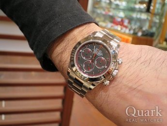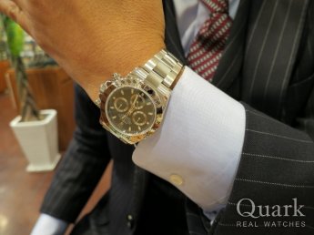 ロレックス=デイトナというイメージがあり、ステンレスの116520と迷ったけれど、ホワイトゴールドの赤針のフェイスとクロノ針がとても気に入ったのでブラックアラビアにしました。あとは周りに持っている人もいないので被らないと思い。
