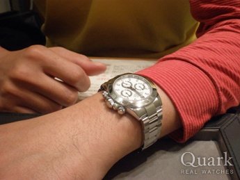 ブラク文字盤と悩みましたが、並べて見るとホワイト文字盤の清潔感と高級感がとても魅力的!!しかもダイヤモンドの輝きがとてもキレイでした。