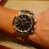 昔からコンビモデルが好きで色々なモデルを使っていましたが、デイトナは縁が無かったのか、購入した事はありませんでした。しかし今回店頭で一目惚れ。試着もほどほどにすぐに購入しました。やはり、王者と呼ばれるだけあってこの高級感は興奮モノです!新型の太字のベゼルは迫力もあり、大変気に入ってます。