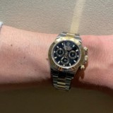 誕生日の記念に前から欲しかったデイトナを選びました。黒文字盤、白文字盤ともに良く、悩みましたが、見比べて黒文字盤に決定しました。
