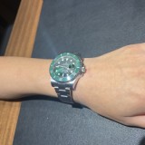 この時計を雑誌で見たときにベゼルと文字盤にグリーンを使ってるから派手なのかなと思いましたが、実際に試着してみると意外に落ち着いた雰囲気でした。Ref.116610LNを購入する予定が、その場で気に入ってしまい即購入!!
