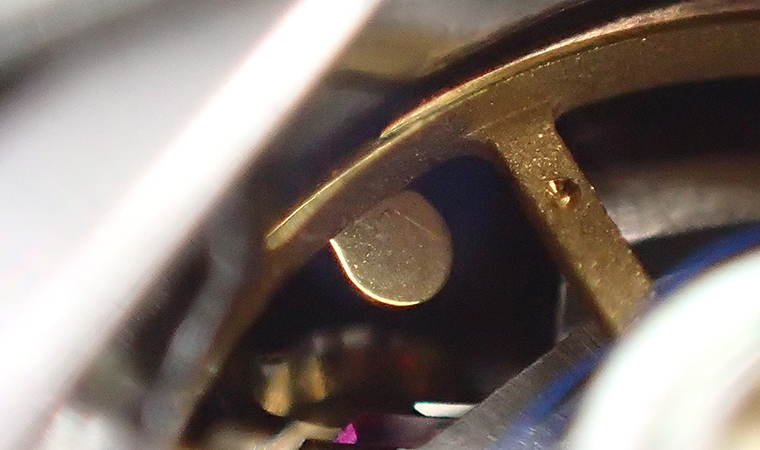 写真は、規制レバーがテンプの動きを止めている状態です。