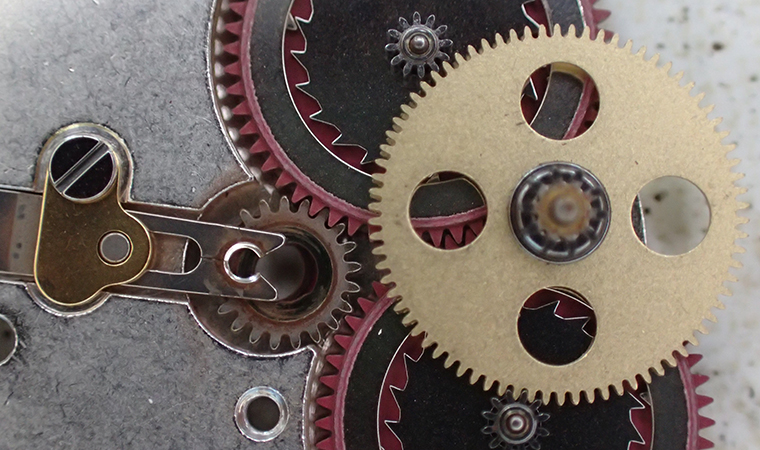 ローターが左右どちらに回転しても主ゼンマイが巻き上げられるように、2つのリバーシングホイール(赤い車※)がセットされています。