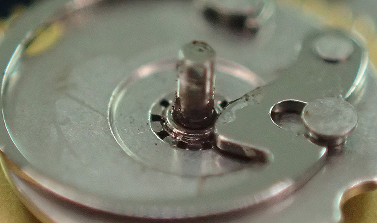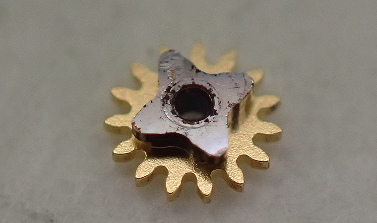 写真は、短針(時針)を単独で操作するための要となるパーツです。これによって針のズレが軽減して、4本の針がどのポジションでも揃いやすくなっています。