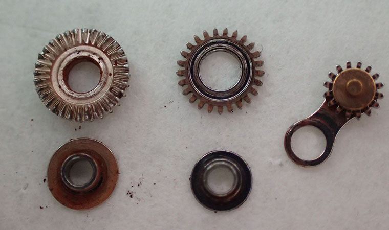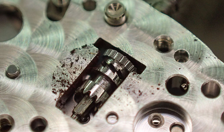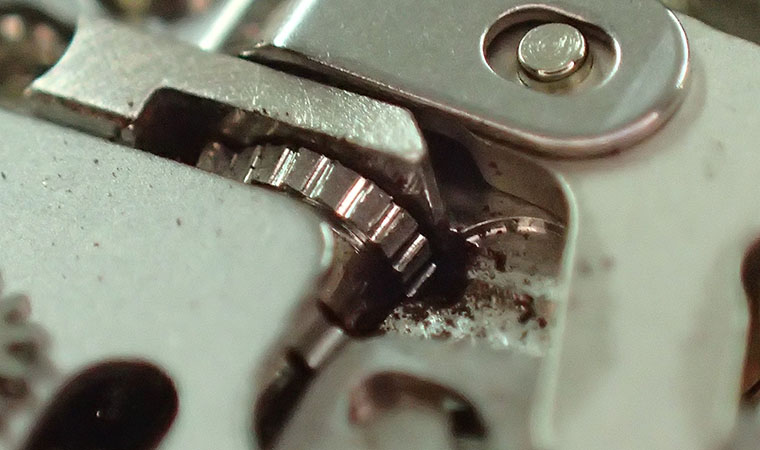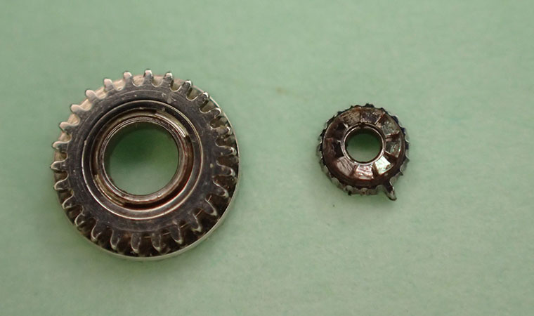 今回のキチ車の破損は、丸穴車周辺にサビが発生したことから、巻き上げ時の抵抗が増加したことでキチ車に想定外の負荷がかかり、歯が欠けてしまったと考えられます。その結果、リューズの空回りという症状が出ました。