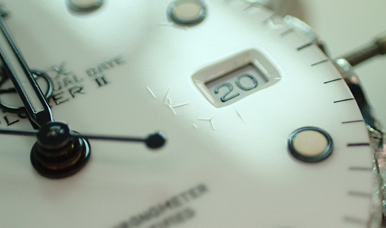 ケースからムーブメントを取り外し、ダイヤルを確認したところ、塗装表面上のカレンダー周りや2時インデックス付近にクラックが入っていました。