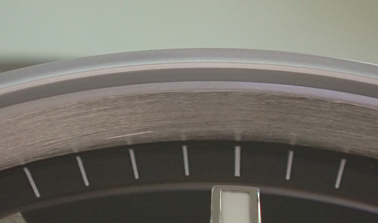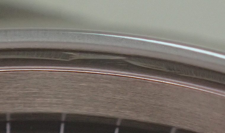 斜め上から覗き込むと、クリスタルとケースの間に劣化したパッキンが確認できます。パッキンの劣化が進行すると、このように目視で確認できます。