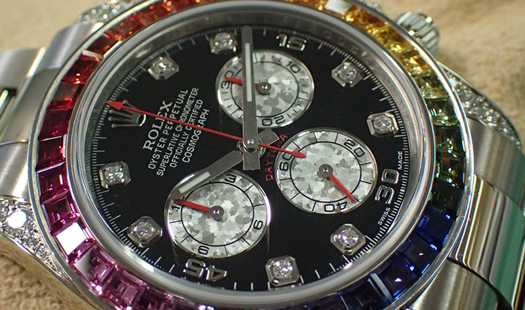 バーゼルワールド2012に発表されたレインボーサファイアベゼル搭載のホワイトゴールド製デイトナです。最大の特徴は、タキメーターの代わりにベゼルに配された36石のレインボーカラーサファイアでしょう。