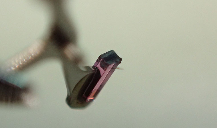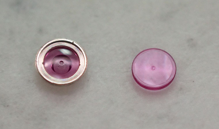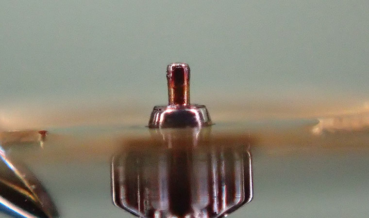 人工ルビー製のテンプの受け石はオイルが切れており、天真の跡が摩耗によりすり減っていました。