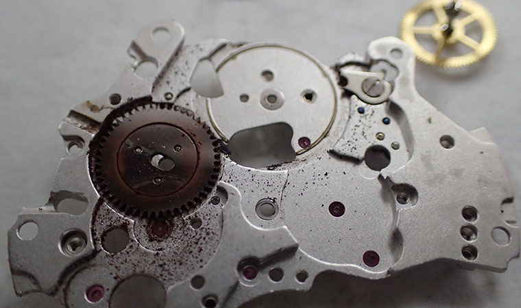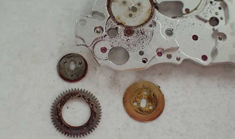 ムーブメント全体にサビが生じており、一見して部分的な修理では済まないことがわかります。