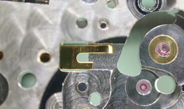 時刻合わせの際、リューズを引く動作に合わせてスライドすることで、先端が天輪を押し付け、ムーブメントの動きを止めます。