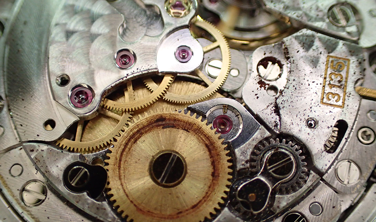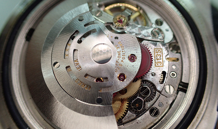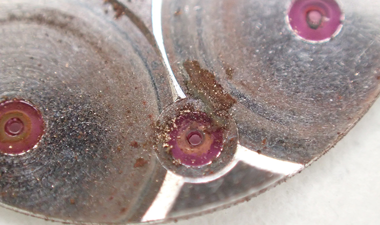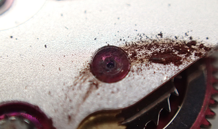 裏蓋を開けますと、ムーブメント全体に鉄粉が広がっていました。