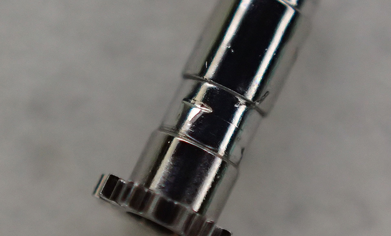 キズのように見える部分を少し潰し、内側の秒カナとの締め具合を適切にすることで改善しました。