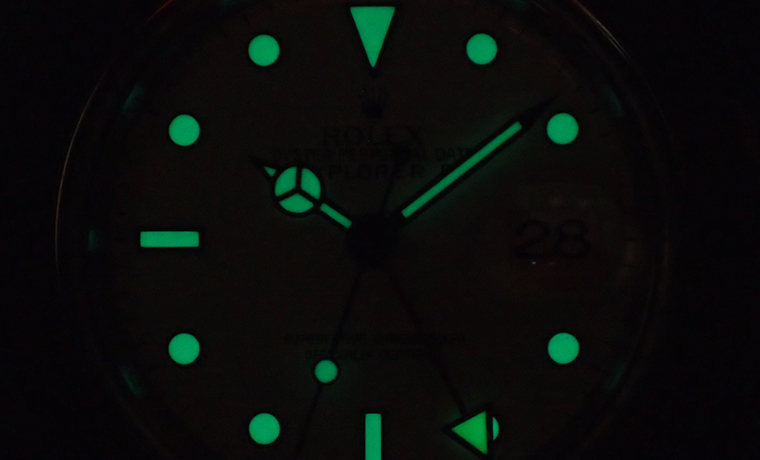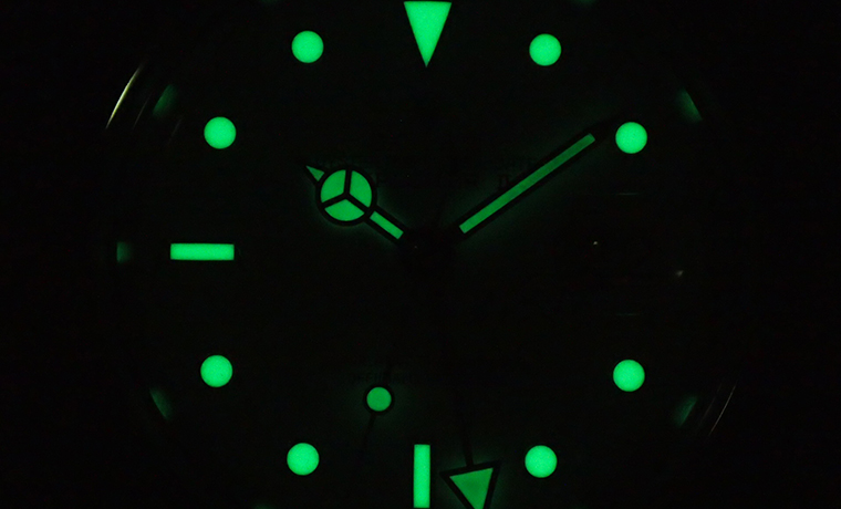 今回、複数本のモデルを比較しましたところ、インデックスの淵が細い最終仕様の方が、夜光塗料は若干白っぽい印象でした。