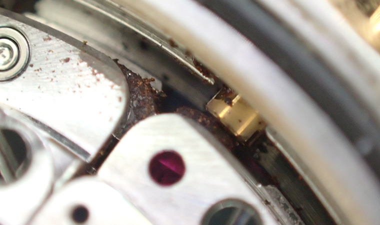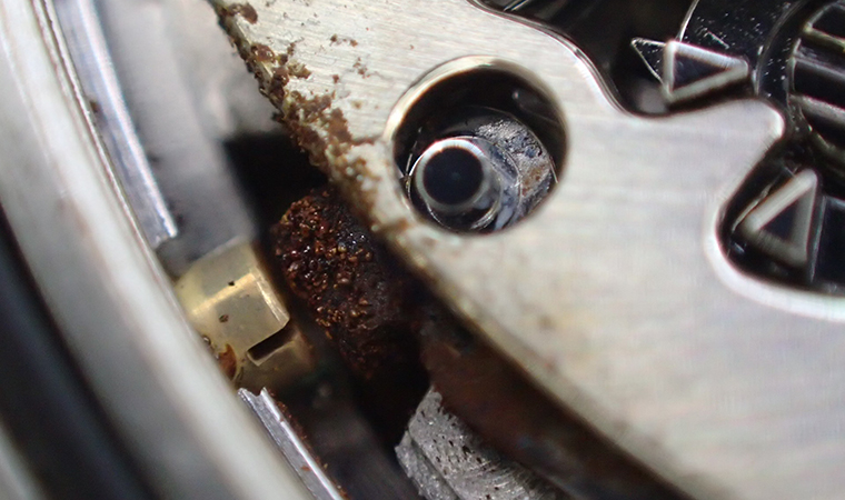 裏蓋を開けてすぐ目に入ってきたのは、サビが発生したレバーでした。