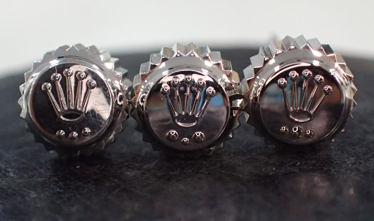 左からステンレス、プラチナ、ホワイトゴールド素材のリューズになります。
