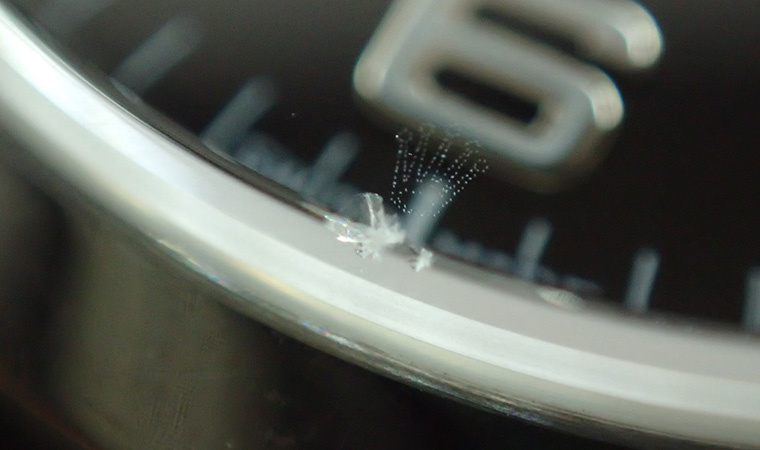クリスタルの破片により、ダイヤルに無数のキズをつけてしまいます。