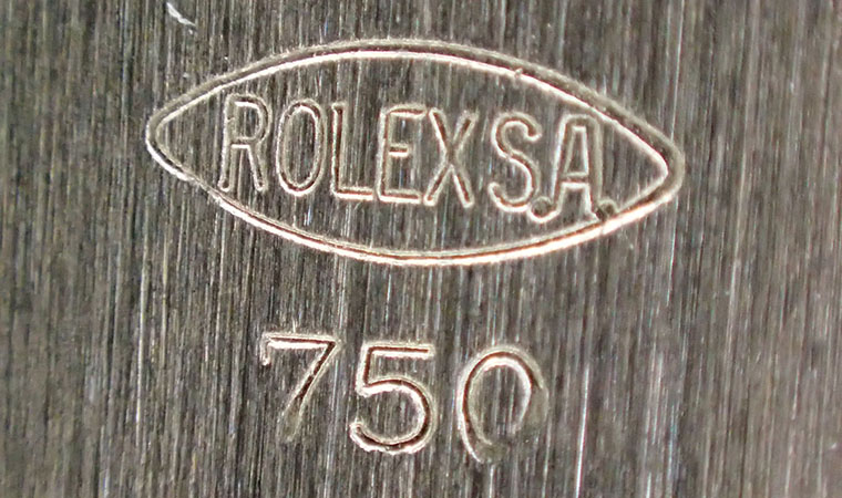 金やプラチナなどの貴金属には、ホールマークと呼ばれる品質を証明する刻印が打たれています。ロレックスの腕時計にも、イエロー・ホワイト・ピンクゴールドの金無垢モデルやプラチナモデルに、このホールマークが刻印されています。