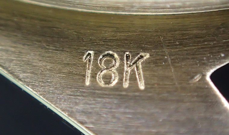 時計の製造年代によって図柄が異なりますが、こちらは天秤マークと女性の横顔が刻印されています。女性の横顔の下に小さく“G”の文字が表記されていますが、こちらは“Gold”ではなく、スイスの“Geneve”を意味します。天秤の数字“750”は18Kゴールドを表しています。