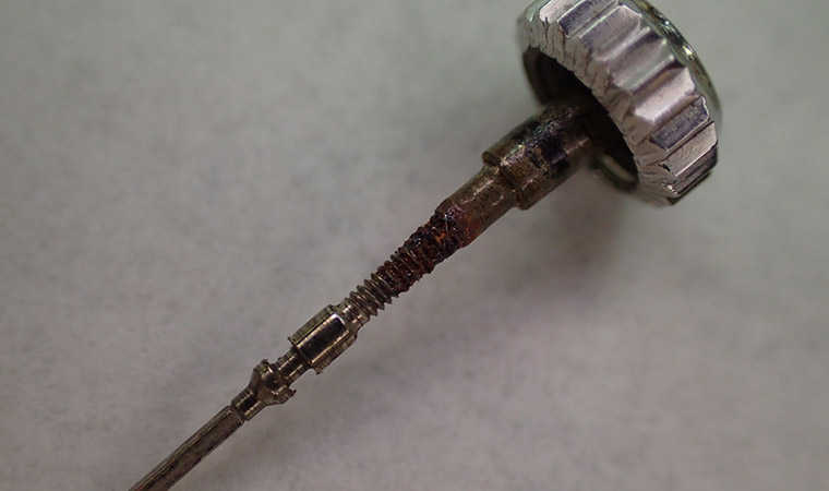 リューズの先部分は巻真と呼ばれ、ゼンマイの巻き上げや時刻合わせなどを行うための大切な部品です。使い方を誤ったりメンテナンスを怠ると、巻真が折れたりサビてしまうことがあります。