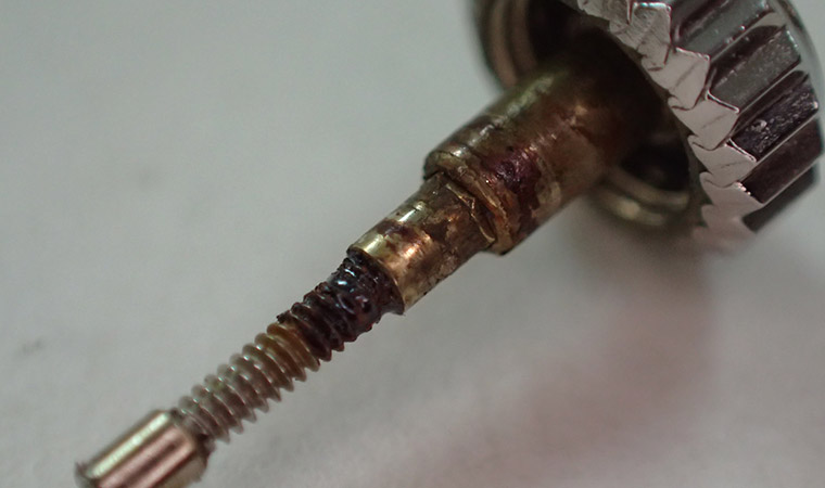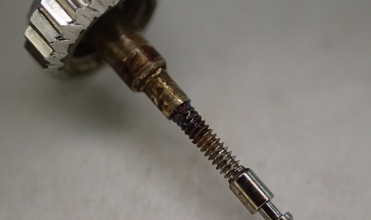 比較的多くの場合、メンテナンス不足によって内部の動きがスムーズに動かなくなり、リューズ操作の際に余分に力が掛かってしまうことでこのように折れてしまいます。