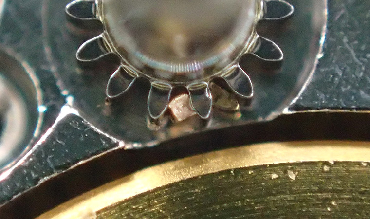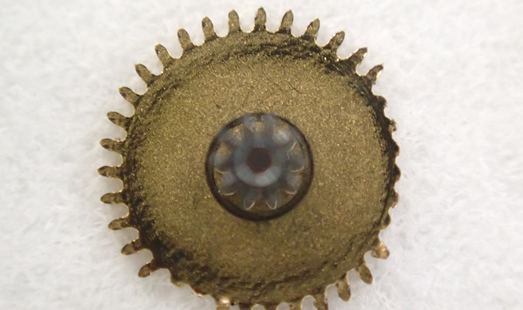 針を動かすために連動する“日の裏車”の歯が欠損、変形しています。