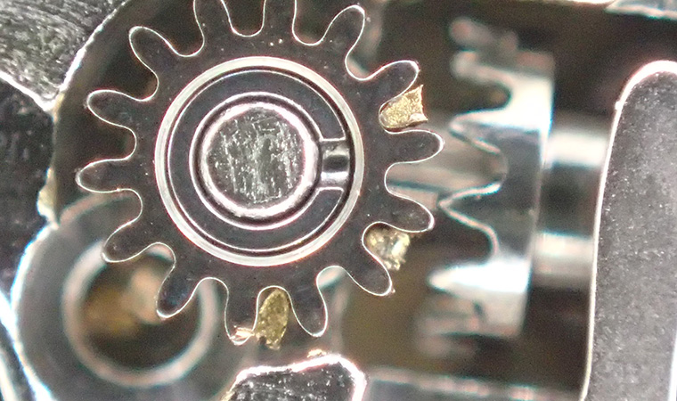 メンテナンス不足によって筒カナのオイルが切れ、回そうとする際の抵抗が増していました。以上のことから原因は、オイルが切れにより抵抗が増したところに、力任せにリューズを回したことで日の裏車の歯が耐えられずに破損したものと考えられます。