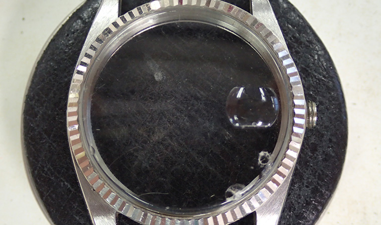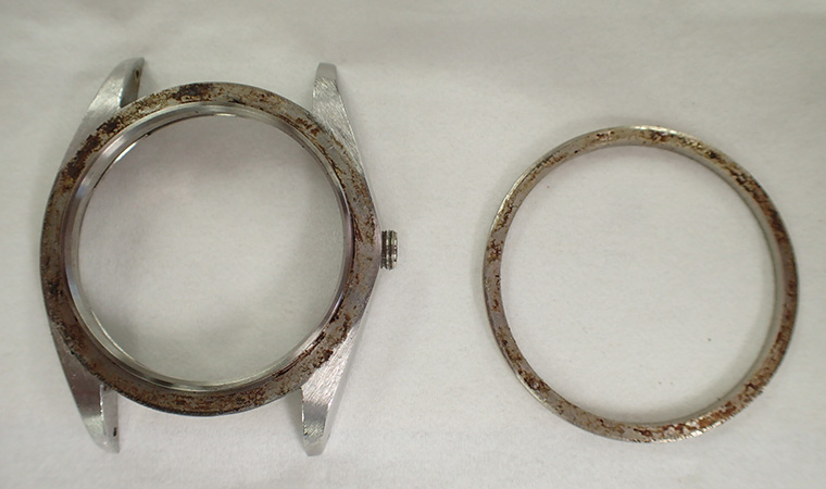 ベゼルを外してみると、やはりサビがびっしりと発生しています。