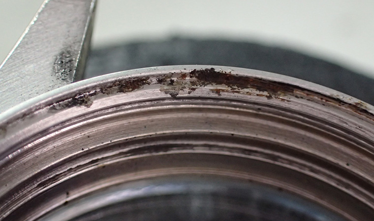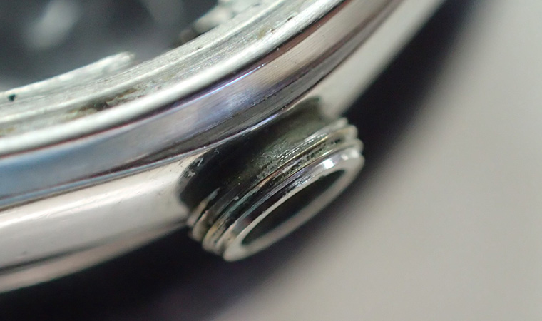 リューズを取り外すと、チューブは腐食が進んでいました。ネジ溝が腐食したことでリューズとの嚙み合わせも悪くなっています。こちらは再利用が出来ず、交換になります。