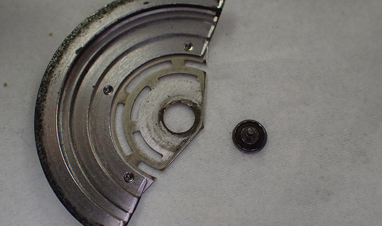 手にとった瞬間、カラカラと聞きなれない音がしました。内部はパーツの接触により削れて発生した大量の金属粉が確認できます。