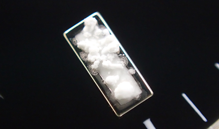 夜光塗料に使用されているルミノバは、アルミン酸塩を主成分としています。この物質は、水に溶けやすい性質のため極少量の水にも反応してしまいます。