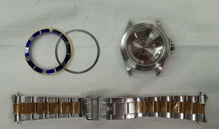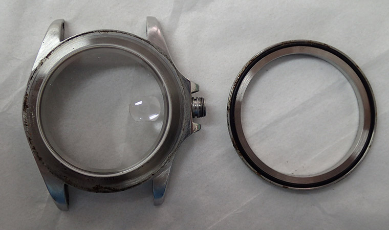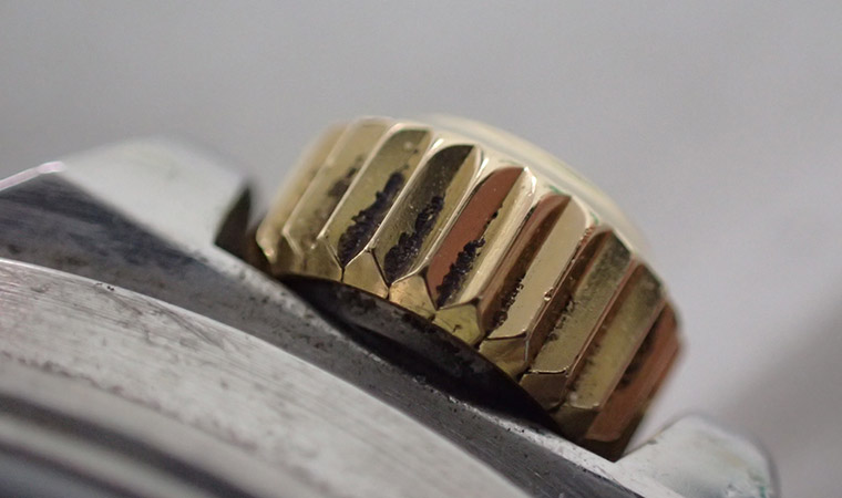 ベゼルディスク下に若干のサビが確認できましたが、防水に影響がでるほどではありません。専用の道具を使い、手作業で丁寧にサビを落とします。