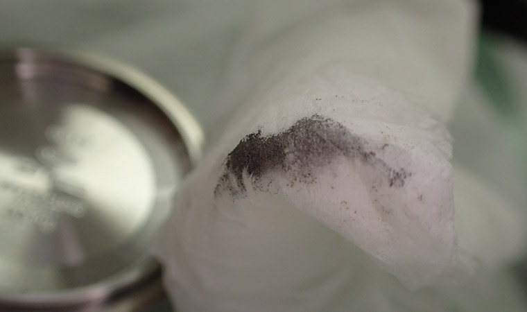 金属粉を拭き取ってみると、このように赤みがかった鉄粉でした。