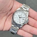 ホワイト文字盤のスポーツモデルが欲しかったのですが、種類は意外と少なく、デイトナは予算オーバーで手頃なものを探していたところエクスプローラーIIを発見。現行モデルとも悩みましたが、私の手首にフィットするのはコチラでした。ホワイト文字盤は清潔感があって、スーツにも合わせやすく重宝しています。