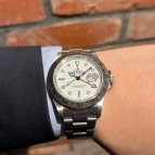 ホワイト文字盤のスポーツモデルが欲しかったのですが、種類は意外と少なく、デイトナは予算オーバーで手頃なものを探していたところエクスプローラーIIを発見。現行モデルとも悩みましたが、私の手首にフィットするのはコチラでした。ホワイト文字盤は清潔感があって、スーツにも合わせやすく重宝しています。