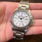 ホワイト文字盤のスポーツモデルが欲しかったのですが、種類は意外と少なく、デイトナは予算オーバーで手頃なものを探していたところエクスプローラーIIを発見。現行モデルとも悩みましたが、私の手首にフィットするのはコチラでした。ホワイト文字盤は清潔感があって、スーツにも合わせやすく重宝しています。