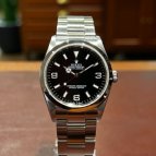 シンプルなデザインが魅力の36ミリエクスプローラーI。スッキリとしたスムースベゼルとオイスターブレスの組み合わせです。2026年1月にオーバーホール・外装仕上げを行っております。バックル・ブレスレットに多少の小傷はありますが、風合いを損なうほどのものではなく全体的に綺麗な状態です。