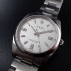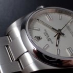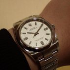 先日、結婚20周年で妻とペアで買いました!!因みに私は、このオイスターパーぺチュアルのブルーを購入し、妻はレディースモデルのオイスターパーペチュアルのブルーを購入しました。ブルーの色合いが落ち着いた雰囲気でブラックよりも柔らかい雰囲気が何ともいえません。妻は出かける時しか着けませんが、私は毎日仕事でも着けて(スーツスタイルですが・・・)、週末のカジュアルな服装の時も着けてます。私の中では相棒になってますね。シンプルながらも、どこか高級感ある雰囲気がたまらないです。ちなみに、私は結構体格は良い方ですが、小さくは感じられませんよ!!今から30周年には何を買おうか一人で考えてます。ロレックスにはまりはじめてます。