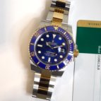 Ref.16613の次期モデルとして、デザインは受け継ぎながらも、耐蝕性と、耐傷性に優れたセラミックベゼルを搭載し、2009年に誕生したサブマリーナーがこのRef.116613LB。通称“青サブ”と呼ばれ、数多くある18Kコンビモデルの中でも、人気・知名度ともに非常に高いモデルである。水深300m(1,000フィート)でも信頼性と精度が保証されるといった長いサブマリーナーの歴史を受け継ぎながらも、随所に新しい技術を取り入れ、サブマリーナー・コンビ史上、最も高級感の溢れるデザインと耐久性で確固たる人気を築いている。ケースラグ部分の大型化によりさらに耐久性を高め、独自開発されたブルーパラクロムヒゲゼンマイの採用で耐磁性・耐衝撃性が向上。ベゼルにはイエローゴールドの特殊コーティングが施された60分の目盛りが刻まれ、潜水時間と減圧停止を正確に測定することが可能。ブレスレットは、前モデルでは中空だった中央のリンクパーツがソリッドパーツに変更され堅牢性がアップ。バックルは堅牢性、高級感、実用性といったあらゆる面から改良が加えられた新型バックル、グライドロッククラスプを採用。使用者本人が工具無しでもブレスの長さ調節が容易にできるようになった。また発光時間もルミノバ夜光塗料の約2倍(8時間)という長さのクロマライトを採用するなどサブマリーナーはダイバーズウォッチとして進化し続けている。