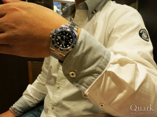 S様 いつもクォーク仙台店をご利用くださいまして誠にありがとうございます。青サブもお似合いだったので、今回のお買い物は私がビックリしてしまいました(笑)。あのあと、飲み会で気付かれましたでしょうか。どれくらいのタイミングでS様が腕元をアピールしはじめたのか、とても気になっております(笑)。GMT‐MASTERII(Ref.116710BLNR)はさりげなくブルーがつかわれており、これまでとはまた違ったイメージでお楽しみ頂けることと存じます。お小遣いは計画的につかってくださいね(笑)。店頭にてブレス洗浄、サイズ調整を無料で承っておりますので、またお店に遊びにきてください!ご愛用頂く上で気になる点などございましたらお気軽にお申し付けくださいませ。三ヶ国の時間表示の使い方も知りたくなりましたら何度でもご説明致しますのでお問合せお待ちしております♪それでは今後とも末長いお付き合いの程よろしくお願い申しげます。