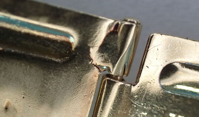 バックル中板の亀裂を拡大した写真です。