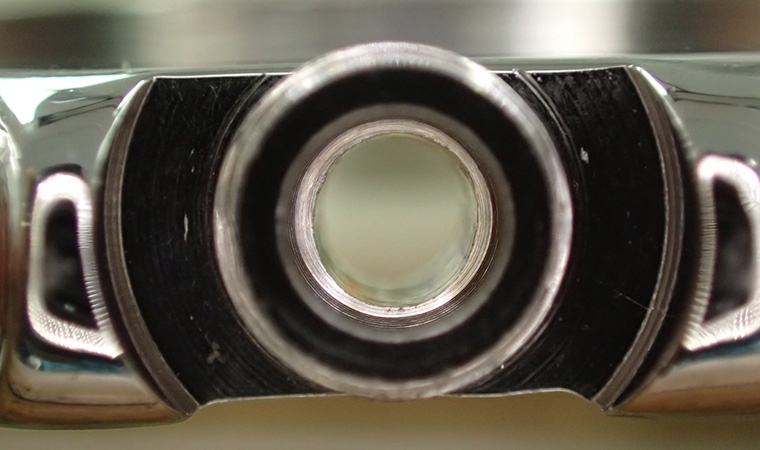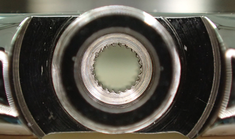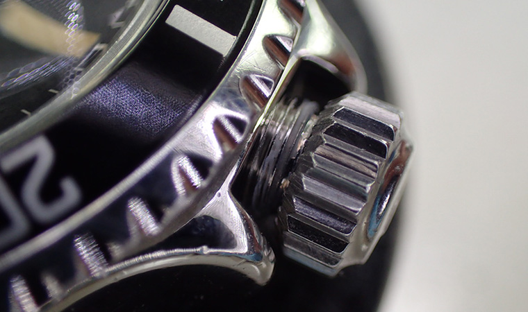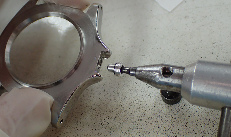 ケースに取りつけましたが、溝にダメージが確認できるため、このままではリューズを差し込めません。