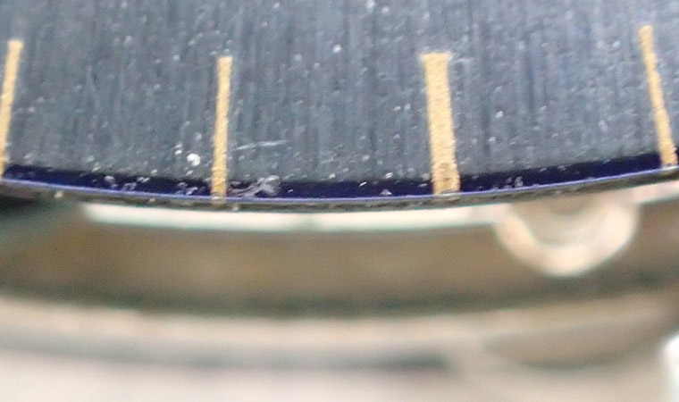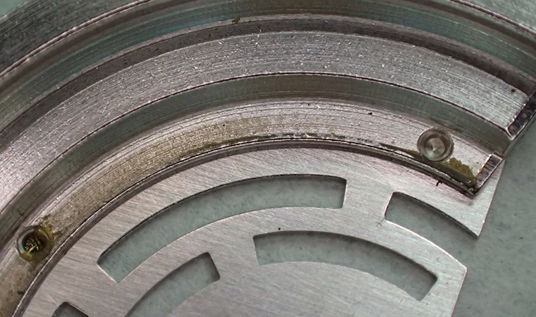 ぶつかった受けは表面が削れ、粉がムーブメント全体に散らばっていました。
