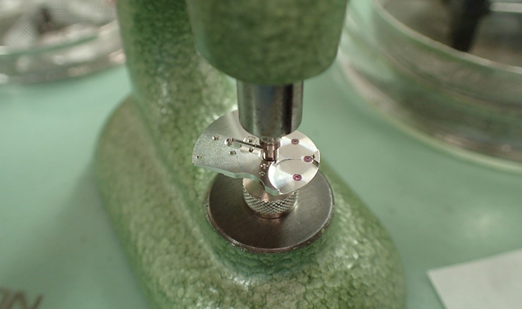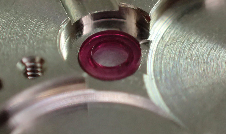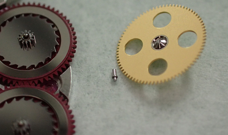 自動巻き機構を分解します。すると、巻上車のホゾが折れていました。手巻き時の違和感はこちらが原因のようです。