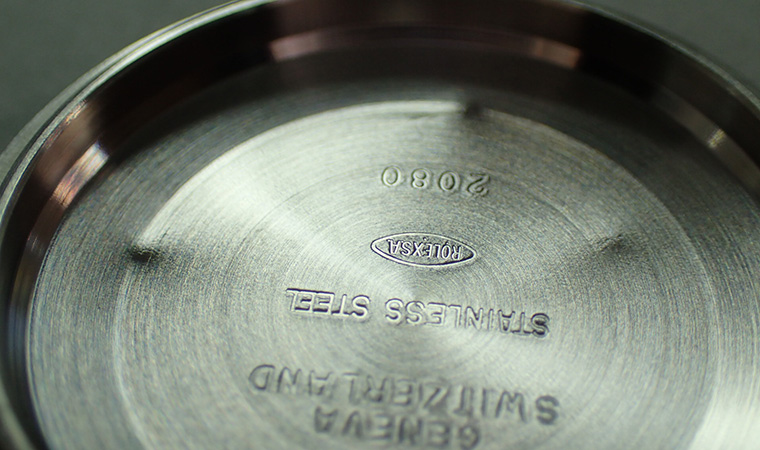 極端に動きの悪いローターとホゾの折れた巻上車、これらの原因を探っていきます。すると、裏蓋に不思議なへこみがありました。