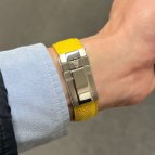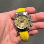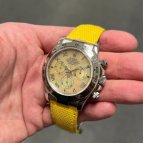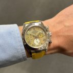 ホワイトゴールドケースのデイトナ、中でもパンダのが欲しくなり、なんば店西村さんに相談したところ、珍しいモデルなのでズバリはないので雰囲気だけ見られますか?とコンビのパンダダイアルを見せてもらうことに。ついでにと白文字盤アラビアの中古を一緒に見せてくださいと取り寄せてもらいました。デイトナはほとんどが黒文字盤だけに、ホワイトアラビアに釘付けになってしまい、白文字盤希望だっただけにパンダをあきらめ、これを購入しました。西村さんの機転に、見るだけがゲットしとかなあかんやろ、に変わった一日でした。